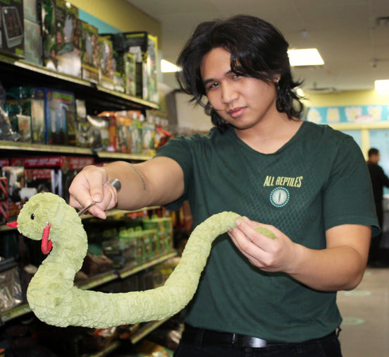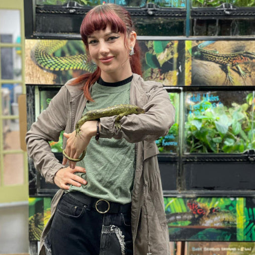It is hard to choose what strikes you most upon encountering Jacob. His wide, mischievous smile or mass of supposedly natural curls. This gentle woolly mammoth's hearty laugh and Dr Dolittle like rapport with reptiles earns respect, admiration and friendship amongst staff and customers alike. But don't be fooled! His superpowers are not always used for good. Quick-witted and a notorious prankster, we all must stay on our gecko toes! Seven years at All Reptiles, Jacob has worked long, tireless hours developing extensive knowledge and eagerly seeks to share with everyone he meets. An avid fisherman, Jacob has graced the store through thick and thin, which only proves, he can't catch anything.