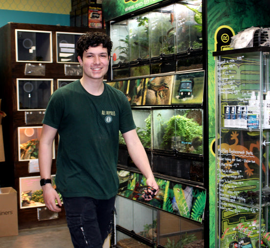 Do not be fooled by his illustrious locks and unassuming demeanor. You may not realize it, but Vince is always observant and quietly learning in his sleuthy ways. Still a little green in the reptile community, Vince has many years of customer service experience under his belt and is a great worker! Vince comes from a close-knit large family with many hobbies but we think his favourite hobby is his Pokémon collection, especially the Whooper. That’s right, we said Whoopers. Ask him and he will tell you what we’re talking about. Have you seen an animated Whooper drawn around the shop somewhere? Guaranteed, it was Vince that drew it. As with so many of our past employees, Vince also has a knack for art and we are hoping to include Vince in our future marketing campaigns to create All Reptiles artwork!